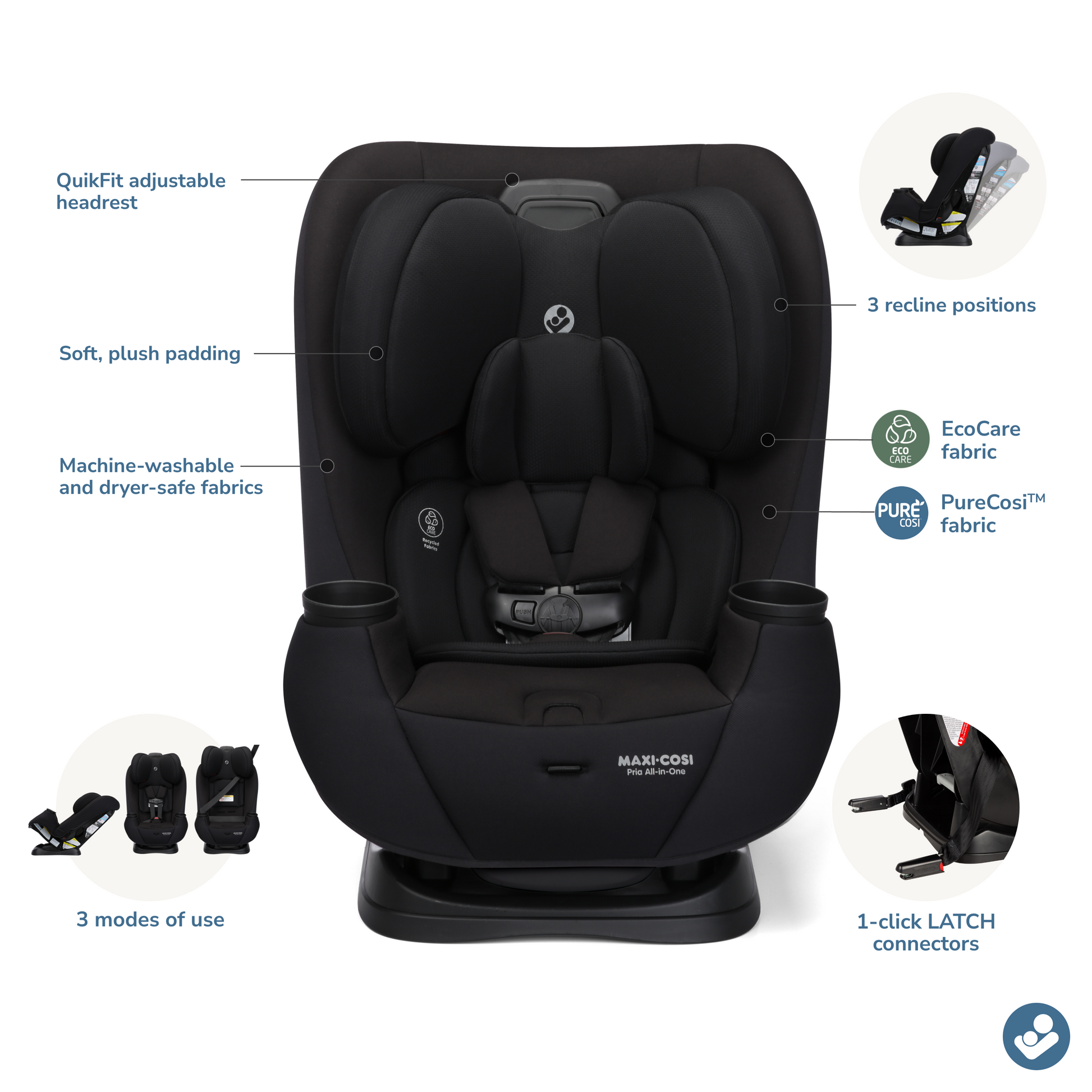Key to the design of this grow with me car seat are the premium fabrics. The Pria All in One car seat is designed with EcoCare, our future-friendly, 100%-recycled fabric made from plastic bottles. The yarn produced is soft, comfortable, and breathable––perfect for your little one. And our soft, plush PureCosi™ fabric is made without added fire retardant treatments, which is better for both your child and our planet. All fabrics are machine-washable and dryer-safe.This all-in-one car seat is ready to journey through the years ahead as you create memories with your little one.
